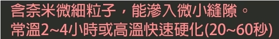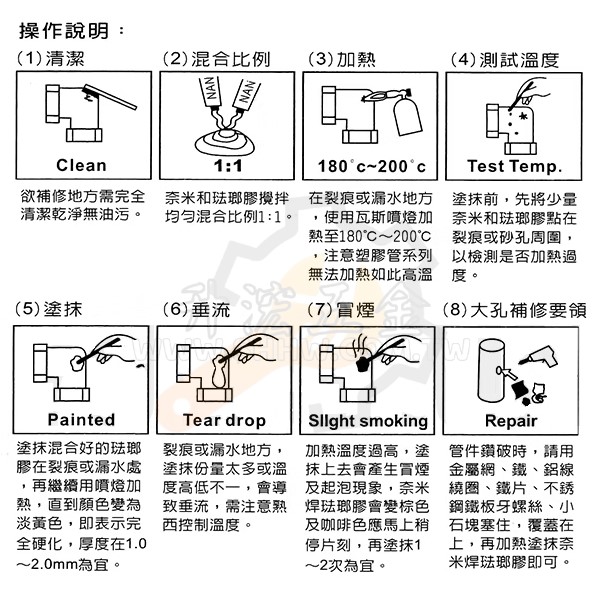 ・鋁、鐵、銅、不鏽鋼、鍍鋅彎頭、三通、硬質PVC管、不鏽鋼銑鐵、塑膠等不同材質材料之接著、修補、防漏、填縫。